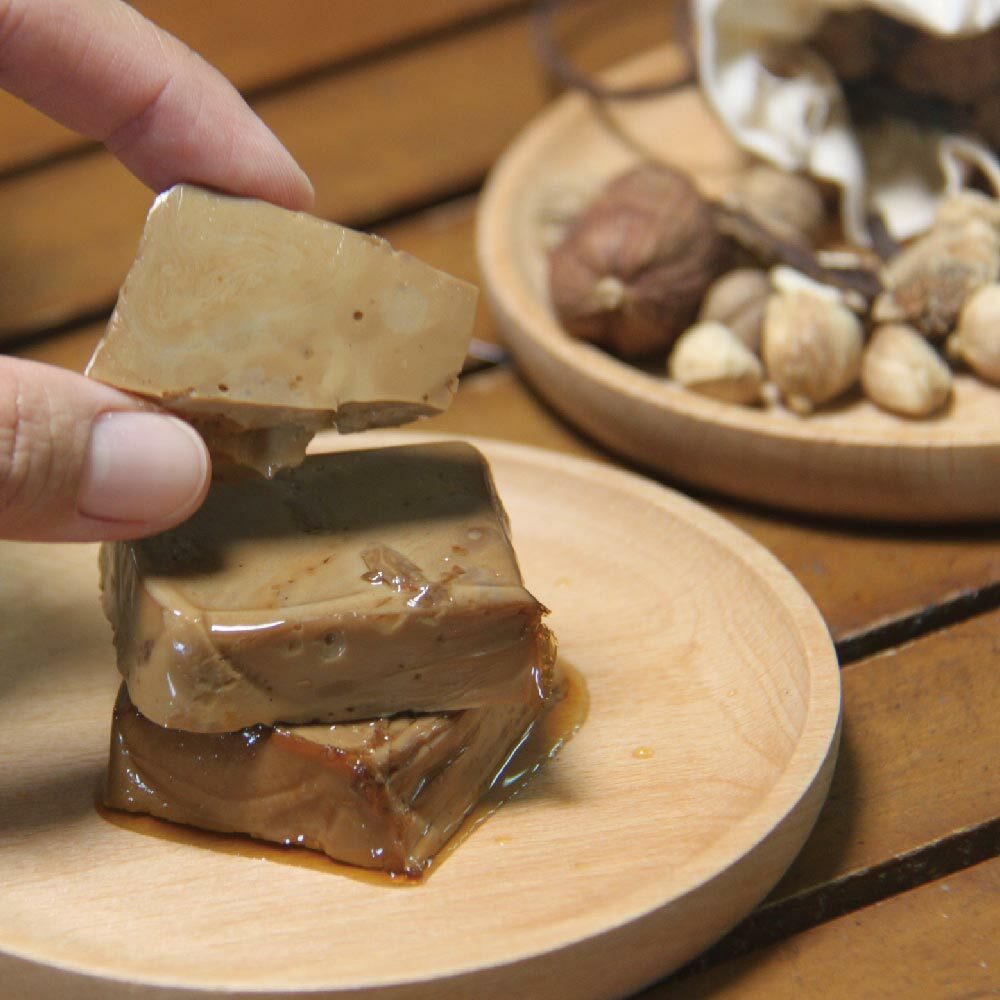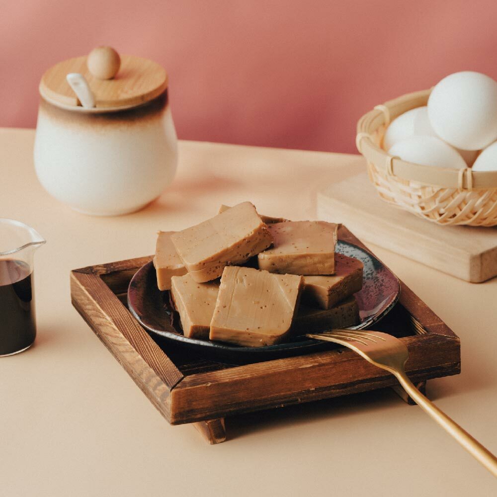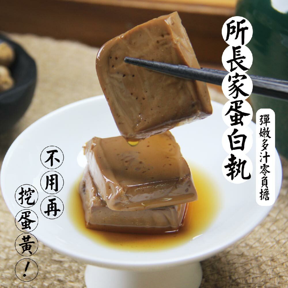 由蛋白經蒸煮後冷卻成型,切成一塊一塊,形似豆干,口感卻大不相同,滑嫩Q彈,新奇又好吃。